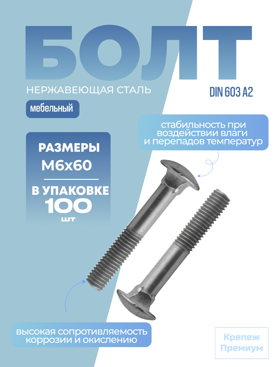 Болт ДИН 603 нержавеющая сталь А2 (AISI 304) M 6х60 в упак 100 шт с полукруглой головкой и квадратным подголовником неполная резьба. Болт мебельный DIN 603. Стандарты аналоги: ГОСТ 7802-81; ISO 8677. Болт DIN 603 — это крепёжное изделие с полукруглой головкой и квадратным подголовником, изготовленное из нержавеющей стали. Этот болт имеет неполную резьбу, что обеспечивает его скрытность в отверстии и эстетичный внешний вид. Особенности болта DIN 603: Материал: нержавеющая сталь А2 (AISI 304), устойчивая к коррозии и воздействию влаги. Полукруглая головка: обеспечивает плотное прилегание к поверхности и снижает риск повреждения материала. Квадратный подголовник: предотвращает проворачивание болта и повышает надёжность соединения. Неполная резьба: позволяет скрыть болт в отверстии и сделать его менее заметным. Болт с полукруглой головкой и квадратным подголовником широко используется в мебельном производстве, строительстве и приборостроении для фиксации деталей и узлов, а также монтажа ограждений.