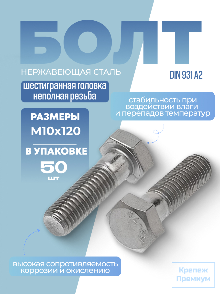 Болт с шестигранной головкой, неполная резьба ДИН 931 нержавеющая сталь А2 (AISI 304) M 10х120 в упак 50 шт. Болт обычный с неполной резьбой DIN 931. Стандарты аналоги ГОСТ Р ИСО 4014-2013; ГОСТ 7798-70; ГОСТ 7805-70; ISO 4016. Болт с шестигранной головкой и неполной резьбой DIN 931 — это крепёжное изделие, которое широко используется в различных отраслях промышленности и строительства. Особенности болта с шестигранной головкой и неполной резьбой DIN 931: Материал: болт изготовлен из нержавеющей стали, устойчивой к коррозии и механическим воздействиям. Это обеспечивает долговечность и надёжность крепления. Шестигранная головка: головка болта имеет шестигранную форму, что облегчает закручивание и предотвращает перекос при установке. Неполная резьба: болт имеет неполную резьбу, что позволяет использовать его в сочетании с гайками или другими крепежными элементами с неполной резьбой.
