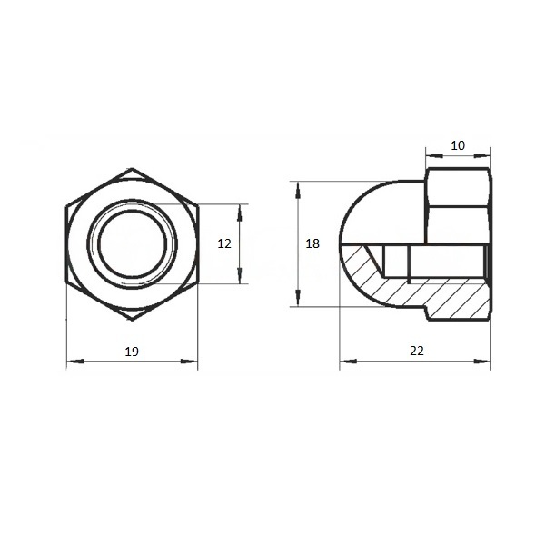 Гайка шестигранная колпачковая высокая ДИН 1587 нержавеющая сталь А2 (AISI 304) M 12 в упак 50 шт. Гайка DIN 1587 шестигранная глухая (слепая) колпачок. Стандарты аналоги: ГОСТ 11860-85 . Гайка шестигранная колпачковая высокая DIN 1587 — это крепёжный элемент, который используется в различных отраслях промышленности и строительства. Она имеет высокую форму и колпачковую поверхность на одной стороне, что обеспечивает защиту внешней резьбы от механических повреждений и агрессивных сред. Особенности гайки: нержавеющая сталь. Колпачковая поверхность: глухая куполообразная. Внутренняя резьба. Использование гайки шестигранной колпачковой высокой DIN 1587 из нержавеющей стали имеет ряд преимуществ: Прочность и долговечность: нержавеющая сталь обеспечивает высокую прочность и устойчивость к коррозии. Эстетический вид: полированная поверхность придаёт изделию привлекательный внешний вид. Защитные функции: колпачковая поверхность предотвращает механические повреждения и контакт с агрессивными средами.
