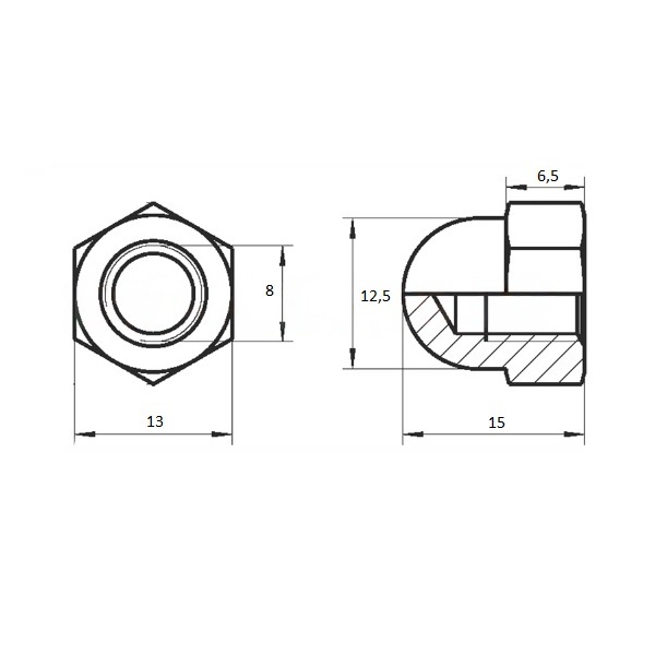Гайка шестигранная колпачковая высокая ДИН 1587 нержавеющая сталь А4 (AISI 316) M 8 в упак 200 шт. Гайка DIN 1587 шестигранная глухая (слепая) колпачок. Стандарты аналоги: ГОСТ 11860-85 . Гайка шестигранная колпачковая высокая DIN 1587 — это крепёжный элемент, который используется в различных отраслях промышленности и строительства. Она имеет высокую форму и колпачковую поверхность на одной стороне, что обеспечивает защиту внешней резьбы от механических повреждений и агрессивных сред. Особенности гайки: нержавеющая сталь. Колпачковая поверхность: глухая куполообразная. Внутренняя резьба. Использование гайки шестигранной колпачковой высокой DIN 1587 из нержавеющей стали имеет ряд преимуществ: Прочность и долговечность: нержавеющая сталь обеспечивает высокую прочность и устойчивость к коррозии. Эстетический вид: полированная поверхность придаёт изделию привлекательный внешний вид. Защитные функции: колпачковая поверхность предотвращает механические повреждения и контакт с агрессивными средами.