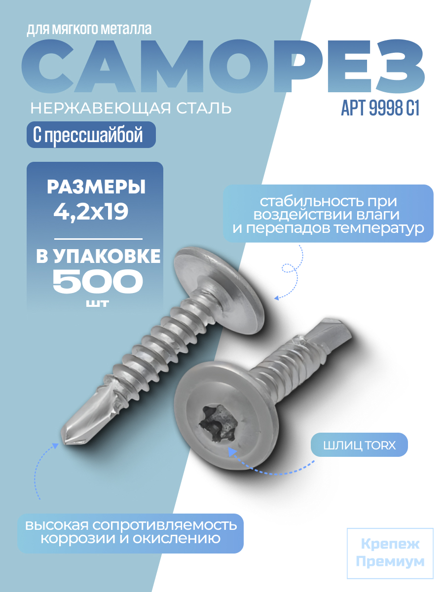 Саморез сверлоконечный с прессшайбой (фланцем), шлиц TORX АРТ 9998 С1 4,2х19 Tх20 в упак 500 шт. Саморез сверлоконечный с прессшайбой (фланцем) АРТ 9998 применяется для крепления различных материалов, таких как дерево, пластик, ДСП и алюминий. Оснащён самосверлящим наконечником для быстрого и простого монтажа. Он используется в монтажных и ремонтных работах, а также для сшивания листов из мягких металлов и крепления в алюминиевых профилях малой толщины. Пресс-шайба (фланец) повышает площадь контакта головки шурупа с поверхностью, что улучшает герметичность соединения.