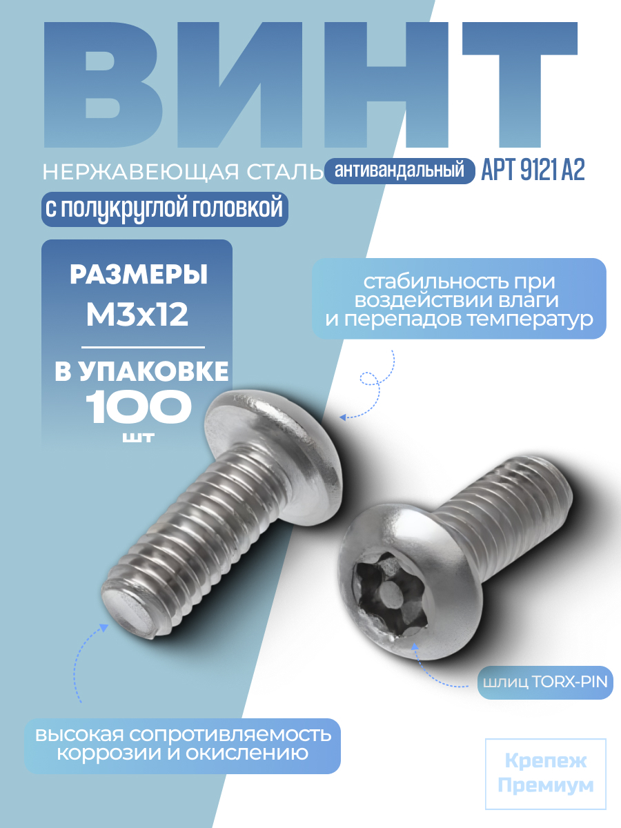 Винт АРТ 9121 нержавеющая сталь А2 (AISI 304) M 3х12 Tх10 в упак 100 шт антивандальный с полукруглой головкой, шлиц TORX-PIN. Винт АРТ 9121 из нержавеющей стали, оснащённый шлицем типа “Torx-PIN” со штифтом, предназначен для антивандального крепления в условиях, требующих повышенной безопасности и защиты от несанкционированного доступа. Благодаря своей антивандальной конструкции и устойчивости к коррозии, винты АРТ 9121 обеспечивают надёжное и безопасное крепление в самых разнообразных условиях эксплуатации.