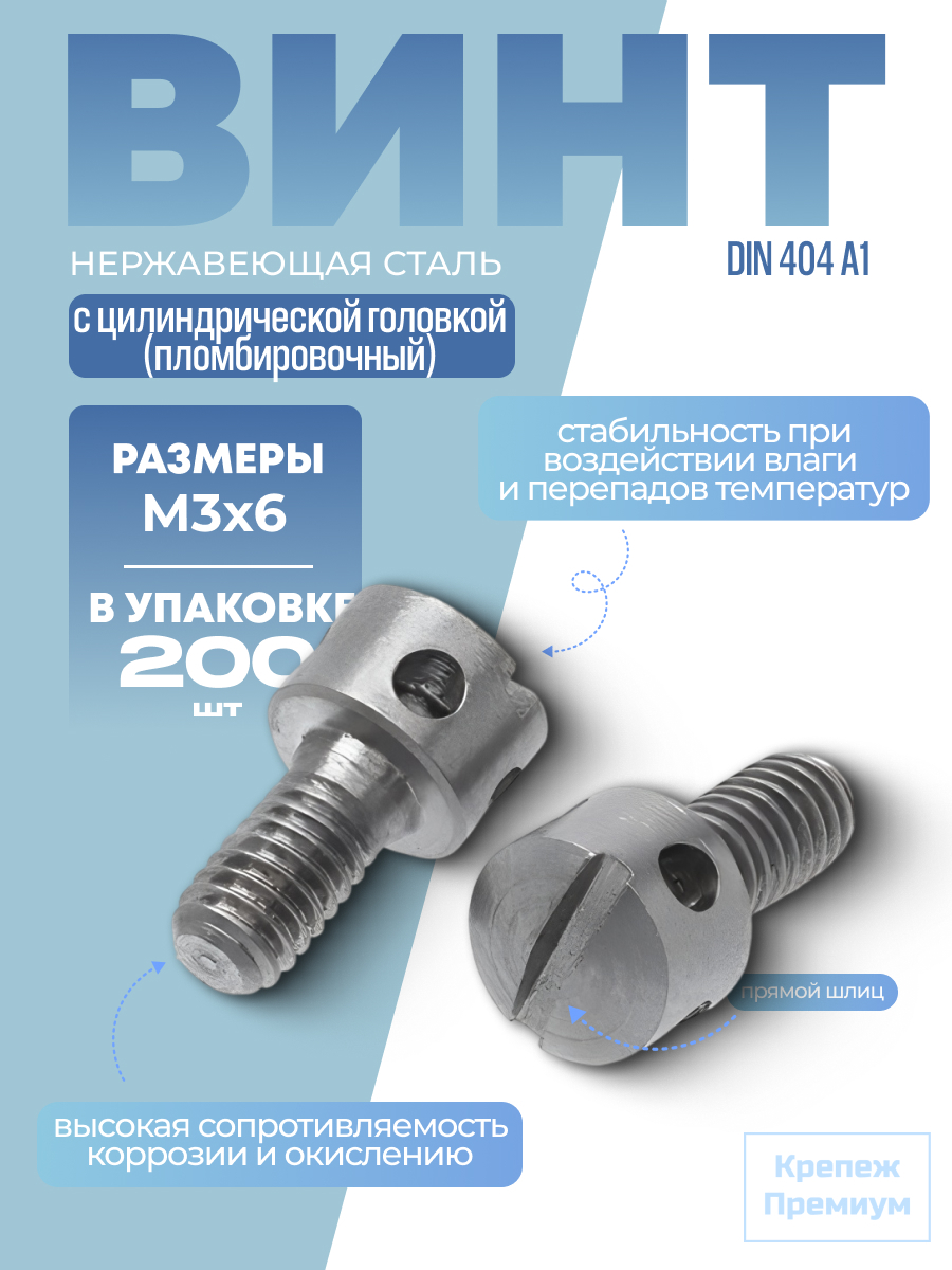Винт ДИН 404 нержавеющая сталь А1 M 3х6 в упак 200 шт с цилиндрической головкой с отверстиями [пломбировочный], прямой шлиц. Пломбировочный винт DIN 404 — это специализированный крепёжный элемент с цилиндрической головкой и прямым шлицем, предназначенный для пломбирования различных устройств и конструкций. Он изготовлен из нержавеющей стали, что обеспечивает высокую прочность и устойчивость к коррозии. Увеличенная головка и два радиальных отверстия обеспечивают дополнительную прочность и устойчивость к взлому. Прямой шлиц облегчает закручивание и откручивание винта. Нержавеющая сталь гарантирует длительный срок службы и устойчивость к коррозии.