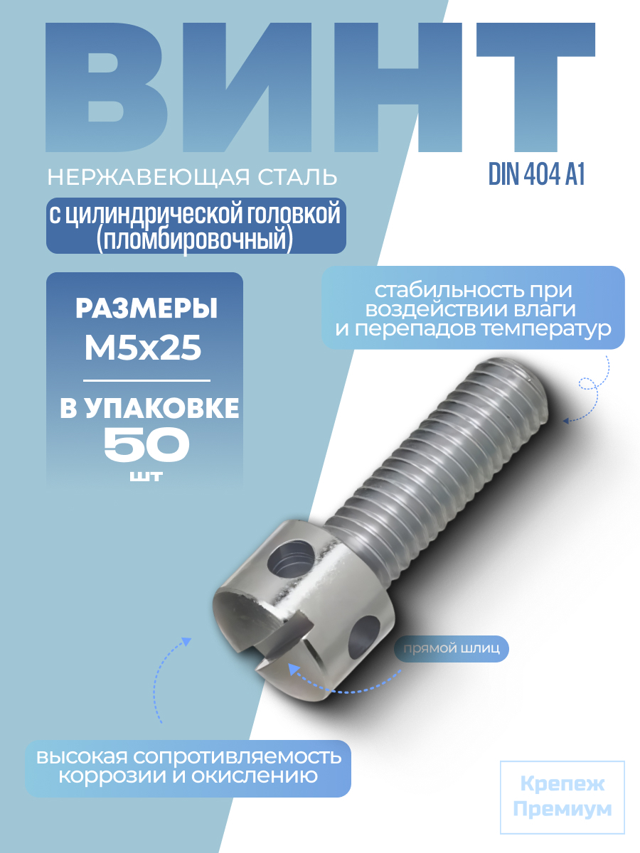 Винт ДИН 404 нержавеющая сталь А1 M 5х25 в упак 50 шт с цилиндрической головкой с отверстиями [пломбировочный], прямой шлиц. Пломбировочный винт DIN 404 — это специализированный крепёжный элемент с цилиндрической головкой и прямым шлицем, предназначенный для пломбирования различных устройств и конструкций. Он изготовлен из нержавеющей стали, что обеспечивает высокую прочность и устойчивость к коррозии. Увеличенная головка и два радиальных отверстия обеспечивают дополнительную прочность и устойчивость к взлому. Прямой шлиц облегчает закручивание и откручивание винта. Нержавеющая сталь гарантирует длительный срок службы и устойчивость к коррозии.